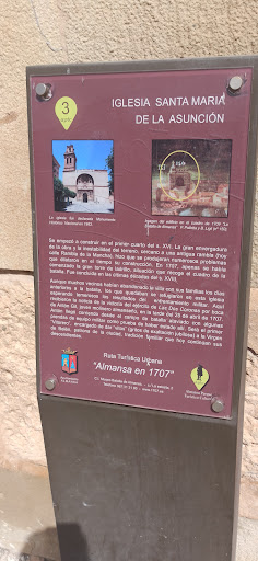 Información de la web de turismo de Almansa: El monumento es el resultado de varias etapas constructivas, desde el siglo XVI al XIX. En la puerta de la Iglesia aparece inscrita la fecha de 1639. Detalle de la Capilla de la Comunión, anexa a la Iglesia Arciprestal de la Asunción El 30 de abril de 1524 el Obispo de Cartagena señaló los nuevos terrenos para la construcción de una Iglesia. Estos terrenos, al lado de la Rambla, eran propiedad de Alonso de Pina, y ante su desacuerdo a cederlos, fue obligado por el Marquesado de Villena. La construcción de la Iglesia fue larga: entre 1524 y 1526 el encargado de excavar los cimientos para la construcción de este nuevo templo fue el Maestro Marquina; en 1526 fue el Maestro Pedro quien realizó la traza de la nave, en 1530 y hasta 1538 se levantaron los muros de la nave, las capillas laterales, se añadieron los contrafuertes y una falsa cubierta de madera, todo ello obra del Maestro Juan de Aranguren; y en 1572 se añadieron más contrafuertes y se consolidó la Capilla Mayor; también se realizó la traza definitiva de la fachada (1619-1624) y la finalización de la Sacristía y la Sala del Cabildo (1630-1650); y de 1680 a 1799 se construyeron la Capilla de la Comunión y una de las torres de ladrillo, de las dos proyectadas. En el interior de la Iglesia de la Asunción, cabe destacar su espectacular bóveda de cañón, y las capillas laterales de bóvedas de crucería, estilo gótico. La cabecera de la nave está inspirada en el Palacio de Versalles. En el exterior, destaca en la fachada de la Iglesia el tema de la Asunción, y la impresionante torre de ladrillo macizo. Al lado de la nave principal está la Capilla de la Comunión, de estilobarroco. La portada, a los pies del templo, es de concepción renacentista y se halla cobijada bajo un amplio arco. Su interior es neoclásico con nave única (gótica) y cabecera semicircular con columnas corintias, lo que le da un aire muy francés y recuerda la Capilla Real de Versalles. Las capillas laterales, de planta rectangular góticas, alguna incluso con pilares helicoidales. Una única torre de ladrillo visto, barroca, de la segunda mitad del siglo XVIII, se alza en la fachada en el lado del Evangelio. En ese mismo lateral está la Capilla de la Comunión, fechada en 1763, de planta de cruz latina y cúpula en el crucero y con portada enteramente rococó finamente labrada. La segunda torre no se construyó en su momento por falta...