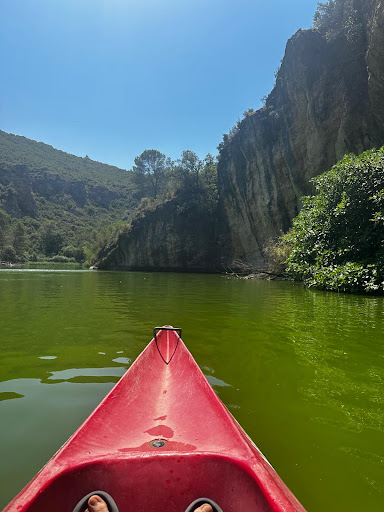 La zona de playa, donde puedes bañarte y alquilar kayaks (7,50 € por persona y por hora). Aunque está bien para un paseo, una hora se queda corta si quieres llegar a las zonas más bonitas del embalse. Justo cuando alcanzamos una parte con el agua más limpia y agradable, ya tocaba dar la vuelta. Esa zona solo se puede alcanzar en kayak.