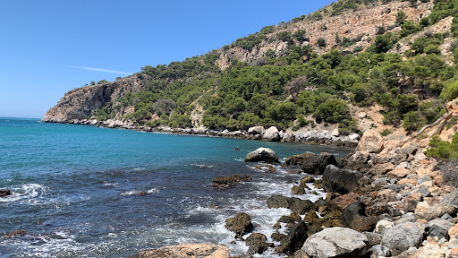 La gente va aquí en busca de paz y tranquilidad y la encuentra antes en una playa común que aquí. La gente tiene muy poca educación y no dejan de llegar por muy llena que esté y se te ponen al lado toalla con toalla sin ningún tipo de distancia, que si a alguien le huelen los pies, créeme que se los olerás. Por no hablar de la gente que va con perros, que parece que se dan todos la mano y nada más llegar los sueltan y se adueñan del lugar. Una cala tan pequeña con 5-6 perros grandes es imposible meterse en el agua. También llegan muchas pero que muchas personas con grupos y dejan los kayaks por donde pillan, colapsando toda la minúscula orilla que hay. En definitiva, cala muy bonita, pero desconectar 0, vas a agobiarte más que en cualquier otra playa tanto por estar rodeada de perros dándote golpes con el rabo con dueños impasibles, como por el poco respeto que tiene la gente de ver que la cala está llena y seguir bajando...