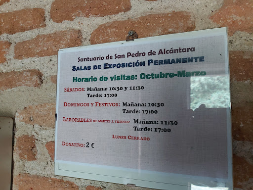 Read moreDentro del Santuario de San Pedro Alcántara, se encuentra este museo sacro, con varias obras relacionadas con el mismo Santo nombrado anteriormente y con la Iglesia. En el, encontramos varias salas en las que hay expuestas figuras, reliquias, atuendos eclesiásticos y cuadros. La persona que dirige la visita, da explicaciones interesantes sobre las obras más destacadas, haciéndola amena. Se recomienda concertar las visitas, ya que tiene...