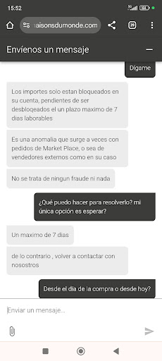 Os cuento mi caso. El 15 de enero compré unos muebles para el patio de mi casa a través de la página de Maisons Du Monde (en adelante MDM), resulta que el producto lo vende un tercero (esto ya me entero después, posiblemente por falta de atención mía) que es KACTUS REPUBLIC by La MIrror Management SL. Pues el 19 me llama el transportista, de muy malas formas, y me dice que la mercancía la puede dejar en mi domicilio sólo por la mañana. Mi mujer y yo entramos a las 8, por lo que le comenté el dejarlo por la tarde, aunque fuera otro día (son muebles para el patio y estábamos en enero, prisa no tengo). Pues finalmente quedamos el viernes 20 a las 7.45 de la mañana, y mi sorpresa es que lo deja en la calle...un palet doble en la calle, lloviendo y sabiendo que a las 8 tengo que estar en mi trabajo. Total que le digo que lo devuelva, que no quiero la mercancía en esas condiciones. Acto seguido, solicito por la página anulación del pedido. Bien, estamos a 6 de febrero y el cargo de 990 euros no me ha sido devuelto, y la contestación por escrito de KACTUS ha sido que hasta que no reciban la mercancía no me hacen el reembolso. Es decir, ¿de algo que yo devuelvo el día 20 de enero y que no han recibido? ¿qué tengo yo que ver con la devolución de algo que no he recibido?. Me parece lamentable la actuación de esta empresa y MDM no debería trabajar con según que colaboradores que manchan la imagen de ellos. Parece que sólo me queda denunciar para poder recuperar el dinero....