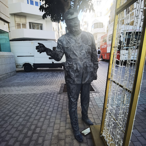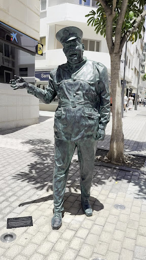 Statue of Heraclio Niz Mesa "Pollo de Arrecife". Inaugurated in 2017, sculptor Rigoberto Camacho, Calle Leon y Castillo Heraclio Niz was ... prominent Canarian wrestler and actor in the 60s ... Guadarfiá, police officer in Arrecife, even head of the municipal police force ... called himself Pollo "Chicken" of Arrecife ... was also appreciated for his friendly, affable and generous way of dealing with locals and tourists. He was awarded a medal for tourist merit and the Cross of the Order of the Knights of Cisnaros. ... also gave his name to the 2019 wrestling ground. ... died in 2010 at the age of 80. The idea for the statue came from Andrés Medina in collaboration with Francisco Hernandéz, graduate of the "Bellas Artes" of the University of La Laguna. Originally, the statue was supposed to stand in a roundabout, but now it is at the beginning of the large shopping street...