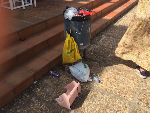 El ayuntamiento NO HA COLOCADO CONTENEDORES, no ya de reciclaje, ni siquiera normales a la salida de las maderitas (en ningún lado)y todo se acumula en las papeleritas del paseo donde no cabe la basura. Todo termina colocándose en el suelo. Lo recogen con poca frecuencia y por la mañana por lo que el viento de la noche hace que se vuele todo. En las fotos pueden verse ejemplos de la ausencia de contenedores en cada salida y las papeleras a reventar.
