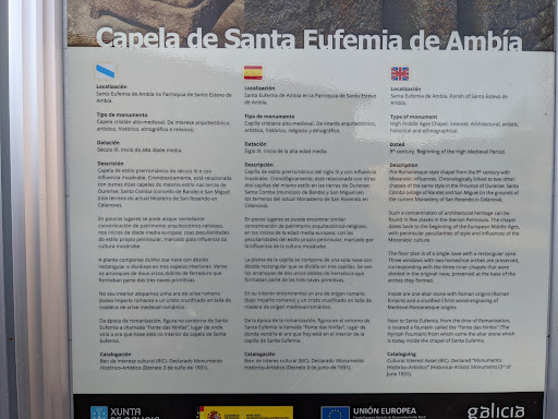 Read morePequeña capilla pre-románica, construida en el siglo IX. Fuimos a verla, siguiendo las indicaciones del guia de la Colegiata de Xunqueira. Para visitarla hay que pedir que la vengan a abrir los cuidadores que viven en casas cercanas. Está indicado en la puerta. Es de pequeñas dimensiones, de una sola nave y ábside rectangular. Destacan en el interior las dos aras romanas, las ventanas geminadas y un Cristo tallado en madera, de...