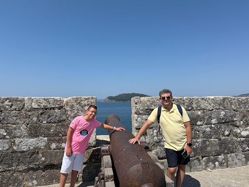 Ich gehe weiter und stehe schließlich auf den alten Festungsmauern. Die Aussicht von hier oben ist schlichtweg grandios. Die Wellen des Atlantiks schlagen gegen die Felsen, und der Wind trägt die salzige Meeresluft zu mir. In der Ferne sehe ich die Inseln des Nationalparks Cíes, die wie smaragdgrüne Juwelen auf dem blauen Meer ruhen. Es ist leicht zu verstehen, warum dieses Gebiet einst so strategisch wichtig war – der Blick auf das weite Meer gibt einem das Gefühl, Herr über das Land und das Wasser zu sein.