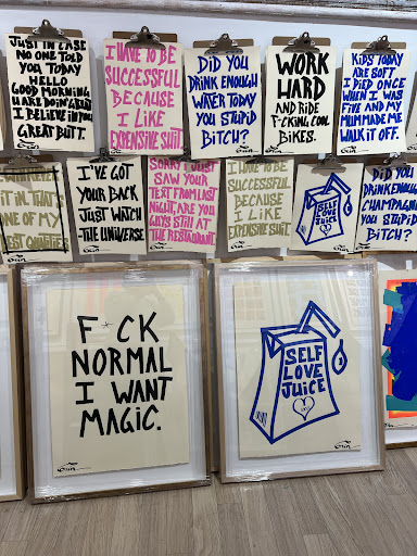 The selection of artworks spans from modern collages to abstract paintings, playing with bold colors and striking shapes. Particularly noteworthy are the pieces featuring inspirational and provocative texts, which provoke thought and add a touch of humor and self-reflection to the gallery.