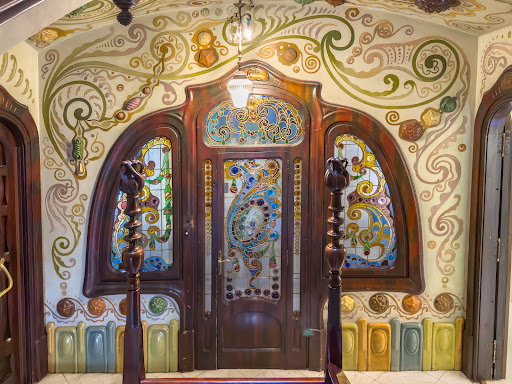 The carved wood door is one of the most impressive in Catalan modernisme with extensive use of cut glass.