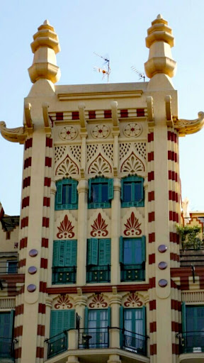 The apartment building combines art deco (fan shapes on the crown, frozen fountain metalwork on the door, zigzag sgraffito), Catalan modernisme (metalwork flowers), Austrian Sezession (round bosses on the crown), and orientalism (palm shapes on the crown).