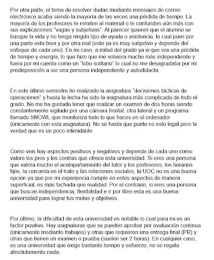 Read moreEn la UOC no todo es profesional. Le doy 3 estrellas porque no te mienten, no hay clases, ni masterclass, todo el contenido se basa en leer, leer y leer (3 estrellas), realizar trabajos, Pruebas de Evaluación Continua (PEC), unas 4 por asignatura y semestre, y normalmente, si apruebas esta, una prueba de síntesis (PS) de 1 hora, o si suspendes la evaluación continua (EC), vas a examen final (EF), de 2 horas. Hay profesores colaboradores que son auténticos profesionales y que quieres que mejores, por lo que se toman la gran molestia de corregir tu PEC y decirte en donde fallas y cómo puedes mejorar, y otros profesores colaboradores que se dedican a subirte la nota y que tú deduzcas con la solución (solpec) en qué has podido fallar, en definitiva, sigue leyendo y auto-aprendiendo. La asignatura de inglés B2.1 y B2.2 es transversal a los grados en esta universidad. Es una asignatura que tienes que realizar obligatoriamente la evaluación continua, y su PS es un writing. Si apruebas la EC puedes realizar la PS. Su método de corrección, a mi forma de ver, y habiéndolo cursado la misma, sobre todo la PS, es bastante mejorable. Te corrigen la PS, y si consideran que tu nivel hablado durante el curso, en las PEC, no es similar al writing, te suspenden con un cero. Puedes tener la suerte de pedir una revisión, y que te digan que "existen discrepancias entre el nivel oral y el escrito" y te mantengan el suspenso, o lo contrario,, que te digan que "existe discrepancia entre nivel oral y escrito" v te pasen al aprobado. De todo menos objetivo, lo veo bastante arbitrario, y sujeto a la voluntad exclusiva del profesorado. Recordemos que la PS es porque ya aprobaste la EC, pero te la ponen igualmente como excusa para intentar justificar un aprobado o suspenso con los mismos criterios. Así que si van a estudiar y no queréis cursar por la suerte de esta asignatura, mejor que os saquéis el B2 en una academia con prueba oficial, y la convalides. En cuanto al nivel de dificultad de las PEC, depende mucho de la asignatura, pero hay PEC bastante tediosas, largas y con mucha carga de trabajo horaria, y PEC que son un poco más asequibles. En cuánto a las PS o EF suelen ser ejercicios y casos similares, aunque no iguales, a los trabajados en las PEC. El tiempo que tardan los profesores colaboradores en contestar es variante, hay profesores que contestan en menos de 24 horas y otros que tardan una semana, depende del profesor. No tienes teléfono para poder llamar a la universidad, con tu tutor te comunicas por correo, y éste o ésta nunca te llamará ni te hará un seguimiento. En definitiva, y con el fin de no aburrir. Metodología de leer el contenido de las asignaturas, que por lo general está bastante bien explicado y actualizado. Los profesores colaboradores todo una lotería. La asignatura B2.2 de inglés una incógnita. Las PS hay algunas asignaturas que en una hora te da tiempo justito de realizar la prueba, en otras, por muy rápido que teclees y tengas claro el temario están pensadas para que no lo completes, o al menos no perfecto o como te gustaría. En mi opinión hay asignaturas que deberían revisar sus créditos, ya que dedicas mucho más tiempo de estudio y de realización de PEC que el estipulado por la carga de la materia, que no se asemeja a los créditos dados por la...