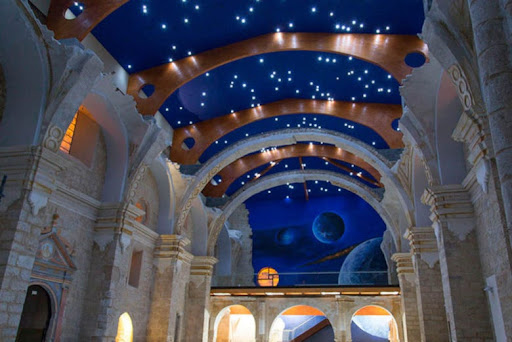 Read morePreciosa iglesia reconstruida, empleada para la divulgación astronómica. Tienen un péndulo de Foucault, que es la primera demostración empírica de que La Tierra es esférica. La bola, colgada de la cúpula del ábside de la iglesia, varía su inclinación con el tiempo, de acuerdo con la rotación de La Tierra. Ponen unos palitos para que los tire, según va variando su ángulo de movimiento.