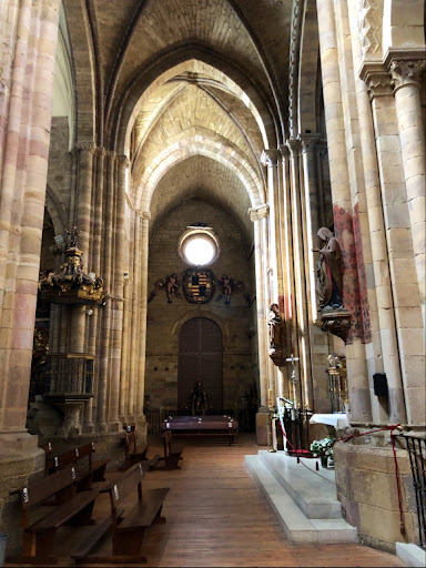 Tiene románico con unas preciosas capillas adosadas en la nave principal; tiene una fachada o puerta principal neoclasica que quizá sea un poco extraña, muy blanca y que no parece conjuntar demasiado con lo demás, y una torre de gótica verdaderamente peculiar porque parece más propia de la zona de Flandes que de Castilla, y está rematada con un pinaculo tipo herreriano no que no sé exactamente cómo acabó coronando la torre.
