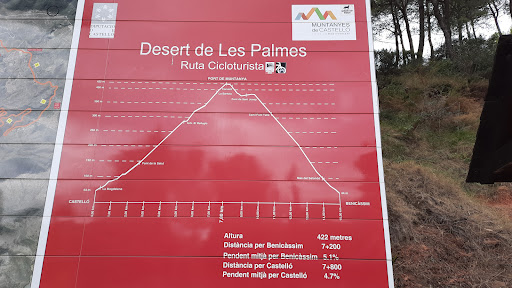Read moreParaje incomparable de subida al Desierto de las Palmas. Zona protegida y de estudio de flora y fauna, mi experiencia ha sido cicloturista con una.subida de 7km a un desnivel medio se 4,5 con zonas del 5,2 ó superior. Muy utilizado por los.practicantes del ciclismo, a su alrededor hay rutas para mtb, como subida al.Bartolo, etc. Espectaculares vistas de la.zona y la.playa en un tramo de mirador que hay en el trayecto. También se pueden hacer rutas de senderismo y a la bajada estas muy próximo a Benicasim donde puedes disfrutar de unas playas estupendas y un ambiente especial en una de las mejores zonas de veraneo de Castellonenses y se ciudadanos de la provincia así como extranjeros que han situado su residencia en esta localidad por su Calidad de vida,...