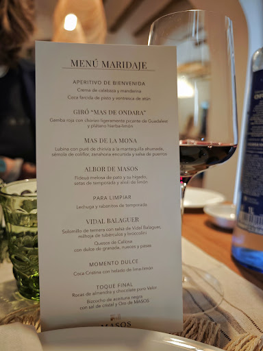 A continuación, el menú maridaje, se prolongó durante casi 3 horas, con una serie de platos que utilizan productos de la zona de gran calidad y correcta presentación, muy bien explicados por un servicio profesional. Se compone de varios pases y un par de postres, adjunto foto con el menú (aunque nos dijeron que en breve cambiará). Respecto a los platos, algunos me parecieron de mejor sabor, presentación y elaboración que otros, aunque esto es muy subjetivo. Me encantó la coca farcida, la lubina con puré de chirivía o la gamba roja con chorizo y plátano. No me gustó la fideuá, que me pareció más una sopa de cocido de pato sin caldo, o la lechuga con rabanitos. Aunque en general estuvo bien, le daría un 7,5 o un 8, sobretodo por la amabilidad del personal.