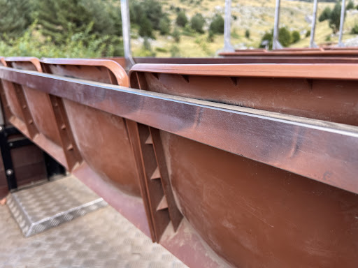 No sé si la DGA gobierno de Aragón, diputación de Huesca o a quien le corresponda administrativamente, está al tanto de esto, pero es absolutamente denunciable e indigno, que un pasajero acabe así de polvo y que no gasten en cubrir las cabinas como sí la tiene el conductor.