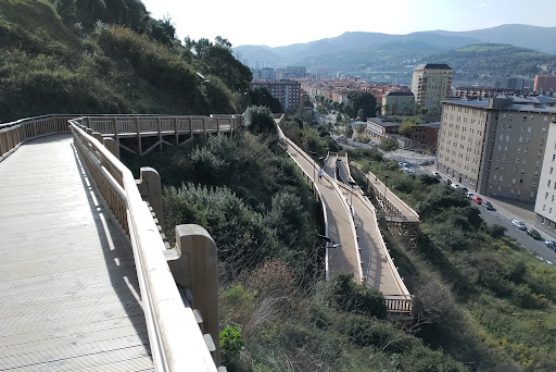 Pasarela que discurre entre Ibarrekolanda y San Ignacio por monte, maravillosas vistas, prohibido patinetes y bicis, tiene un par de miradores con zona de descanso, ya están con pintadas, las farolas son solares,hay alguna zona con desprendimientos en la parte baja, es mejor empezar por Ibarrekolanda ,si lo haces a la contra te tocará subir la pasarela, llegando a la parte alta hay un desvío para coger hacia el monte banderas llegando a Artxanda y mas adelante...