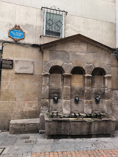 En la calle Perro del Casco Viejo encontramos uno de los símbolos de la Villa, una de esas paradas que no pueden faltar en todo tour turístico. Aquí nos esperan tres leones que nos invitan a beber agua de sus bocas, y eso solo puede significar una cosa, que estamos ante la denominada «fuente del perro». Sí, son leones y se llama la fuente del perro. Aquí debería comenzar una historia que explicase le historia de esta fuente, pero en realidad son dos las leyendas que tratan de justificar su nombre, por lo que juzguen ustedes mismos. La primera, y más conocida, cuenta que esta fuente construida en el año 1800 se llama así porque la población bilbaína jamás había visto un león, y por lo tanto, no sabían ante lo que se encontraban. Debido a esta falta de información, y siguiendo la lógica, se determinó que eran perros, por lo que se bautizó como «la fuente del perro». Admitámoslo, es una historia curiosa y muy vendible turísticamente, pero, ¿es cierta? Realmente cuesta creer que en esa época no supiesen lo que era un león, ya que este se representaba en innumerables escudos. Por otro lado, cabe destacar que con esta historia la sabiduría de la población bilbaína queda muy en entredicho, y es que además de no saber lo que era un león tampoco sabían contar. Recordemos que son tres los leones que vemos, pero estamos ante «la fuente del perro». La otra leyenda cuenta que el origen de este peculiar nombre tiene como protagonistas, cómo no, a un león, a un bilbaíno y a una bilbainada. Según la historia, el dueño de una casa ubicada en esta calle decidió esculpir un león de piedra como guardián de la misma. Tras esta decisión, y no se sabe si para reírse de la ostentosidad del gesto o por lo mal que estaba esculpido, la ciudadanía empezó a llamarlo «el perro». Esta burla tomó tal protagonismo que la calle cogió ese mismo nombre...