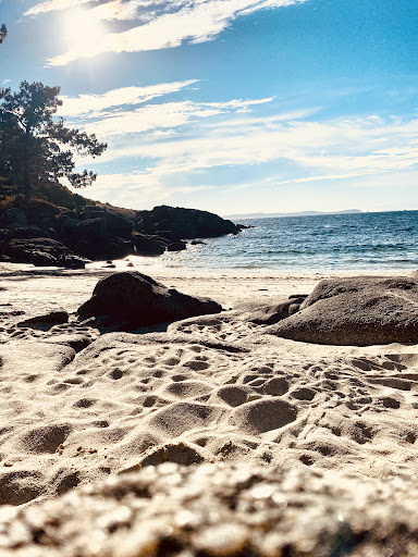 Una vez que llegas, te encuentras con un auténtico paraíso. La arena, a menudo más gruesa y mezclada con conchas, se funde con las aguas cristalinas y turquesas de la ría. El entorno es de una belleza salvaje, con rocas esculpidas por el viento y el mar que flanquean la cala, creando pequeñas ensenadas y rincones íntimos. El sonido de las olas rompiendo suavemente y el canto de las gaviotas son la única banda sonora.