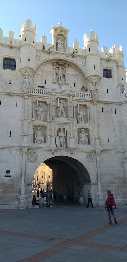 Read moreArco de Santa María (ss. XIV-XVI), en la Plaza del Rey San Fernando, 9 de Burgos (Castilla). Una de las 12 puertas que salvaban el paso a la ciudad de Burgos; comunica el puente de Santa María sobre el río Arlanzón con la Plaza del Rey San Fernando, donde se alza la catedral. Llamada 'Puerta de la Puente de Yuso' (ss. XIV-XV) -como reconstrucción de una puerta anterior, por la que según se cita entraba y salía don Rui Díaz de Vivar (1048-99) en el 'Poema del Mio Cid' (c. 1200)-, a los primeros tiempos -gótico tardío- corresponde el interior, la torre y la fachada intramuros (s. XIV), que mira a la catedral. Entre 1536 y 1553 fue remodelada según diseño renacentista de los maestros arquitectos y escultores burgaleses Juan de Vallejo (1500-69) y Francisco de Colonia (1470-1542). Piedra caliza blanca burgalesa, procedente de Hontoria de la Cantera (Burgos). La puerta fue concebida al exterior como gran arco triunfal, organizado como retablo con remate almenado; las 6 hornacinas centrales, que ocupan estatuas del escultor Ochoa de Arteaga, la ocupan personajes nacionales castellanos: los Jueces de Castilla -don Nuño Rasura y su yerno don Laín Calvo-; los condes don Diego Rodríguez Porcello, fundador de Burgos, y don Fernán González, primer conde de Castilla; el héroe don Rodrigo Díaz de Vivar 'El Cid' y el rey don Carlos I de España -a quien dedico la ciudad el arco para congraciarse con él tras las revueltas comuneras-. Sobre ellos dos maceros municipales, el Ángel Custodio de Burgos, 4 gárgolas y presidiendo la Virgen Santa María, patrona de Burgos, como defensora de la ciudad. El arco cubierto con bóveda de crucería accede por arco de medio punto, en cuyo intradós hay restos pictóricos del s. XVII. Yeserías y artesonado mudéjares en el interior. Fue sede del ayuntamiento hasta la edificación de la casa consistorial (1791) por el arquitecto burgalés Fernando González de Lara (1724-96). Entre 1878 y 1955 fue sede del Museo Arqueológico Provincial de Burgos. BIC (1943). Hoy es Centro Cultural Histórico-Artístico, un espacio museístico con exposiciones permanentes...