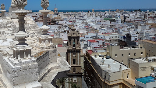 The Iglesia de Santiago Apóstol, also known as the Baroque Santiago Church or the Church of Santiago, Cadiz, faces south-east into Plaza de la Catedralas (Cathedral Square) and located directly next to Cadiz Cathedral which faces north-east into the plaza. Based on designs by Jesuit brother Alonso Romero, the church was built in 1635. It doesn't look much at all from the outside however inside is a different story. The interior is dramatic with spectacular wood carved altarpieces and sculptures from 17th and 18th century and houses a number of baroque works of some famous local artists like Alejandro de Saavedra. Sadly it was closed when I was last in Cadiz however, I managed to get a snap of it's bell tower from the top of...