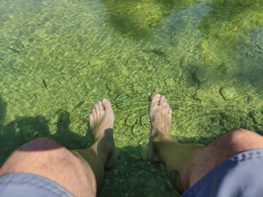También cabe resaltar la cristalinidad de la misma (sobre todo un poco más allá de la zona de la playa, puesto que había mucha menos gente o casi nadie). En ciertas zonas es aconsejable llevar calzado adecuado (escarpines de suela gruesa) debido a las piedras que hay en algunas zonas, especialmente fuera del área de la playa.