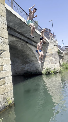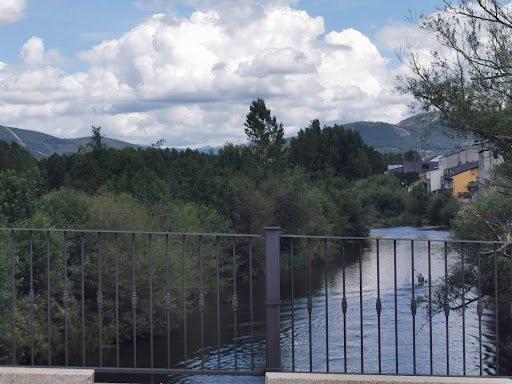 I was there at about lunchtime and planned to relax in and next to the river after lunch in Cacabelos. Free, public parking right next to the river, outside of the town. I'd brought my swimsuit and towel and was all ready. A good number of people in kayaks, swimmers, and people lying in the sun and under the shade trees. Unfortunately, I could see that under the shallow water, there were many rocks. I worried about slipping on them, twisting an ankle, or hitting a knee after slipping, so I decided not to try. It does look very refreshing, however. Tomorrow, I'm going to nearby Molinaseca, where they have a smooth ramp entry into the river and a smooth...