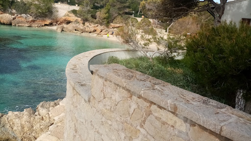in un sabato qualunque di Febbraio, facendo una girata con l'auto a noleggio, dopo il porto di Cala Ratjada, scruto l'indicazione con scritto Platja (é così che chiama la spiaggia nei paesi catalani isole Comprese), a vedere questo cartello un po' trascurato e malconcio , non ci penso un secondo, metto la freccia ed entro in una strada in discesa di 150 metri che mi porta direttamente a questa caletta meravigliosa. Uno spazio molto piccolo, la spiaggia sarà lunga 80 metri, forse meno, un piccolo chiringuito di legno, chiuso perché siamo in bassa stagione e un acqua verde e azzurra che si confonde con l'orizzonte. Il sole va e viene, le nuvole corrono in cielo spinte dal vento di tramontana che soffia ad alta quota, mentre in spiaggia c'è una leggera brezza. Sono catturato dal paesaggio di scogli geometricamente frastagliati e dai pini marittimi che completano questo quadro della natura. In spiaggia poche persone, una ventina probabilmente, un paio di famiglie con i bambini non troppo rumorosi, anziani e un qualche coppietta in vacanza, fondamentale c'è silenzio, si ascolta solo rumore delle onde del mare. Essendo uno spazio piccolo, per chi non vuol stare a contatto con le persone, per i più "avventurieri", è possibile camminare in un percorso e, tra le villette, un po' di sterrato, qualche scoglio da scavalcare, così che si può arrivare in cale piccolissime dove stare un po' più in silenzio e contemplare. Sono spazi dove si può sostare al massimo in due, altrimenti , proseguendo di qualche metro, si può approfittare delle scogliere dove io, accomadatomi su una pietra piatta che sporge dal suolo, ho mangiato un paio di "empanadas", seduto in prima fila con vista sul mediterraneo. A proposito di mediterraneo, l'acqua è così bella che ti invita a bagnarti, per questo così l'occasione e misi i piedi nel mare e feci due passi fino alle caviglie. L'acqua era veramente fredda, ma era quel freddo che ti faceva sentire vivo, felice di stare lì! Alla fine, sono riuscito a sostare in per due ore in questo piccola cala, a pensare che io non sono un tipo da spiaggia: il passare 8-10 ore sulla sabbia ad arrostire al sole non é nel mio DNA. Ovviamente, questo posto essendo piccolo, tra giugno e agosto, è molto affollato con decine decine di persone che si sistemano vicino tra loro per accaparrarsi un "posto al sole". Per chi, ha le ferie ad agosto (e credetemi, so cosa vuol dire, per 15 anni ho avuto le ferie forzate tra la prima e la terza settimana di Agosto...), consiglio, per le coppie di noleggiare a Palma una moto o scooter (i prezzi ho visto che vanno tra le 40 euro per gli scooters e le 80 euro al giorno per moto di grossa cilindrata) mentre, per chi ha famiglia, e/o per chi si sposta con l'auto (se noleggiate una vettura prendete una cabrio, è un po' cara, ma la vacanza ha un altro sapore), consiglio di andare presto la mattina, tra le 8 e le 10, così trovate posto nei parcheggi gratuiti (non ci sono parking a pagamento nella cala) e magari riuscirete a mettere un ombrellone sulla spiaggia senza piantarlo per errore nel cranio a quello del vostro vicino! Nella cala posso c'è la possibilità di approdo ( abbastanza distanti dalla riva) , di imbarcazione private di varia grandezza. Quando sono in sosta, i natanti, rilasciano residui di carburante in mare, quindi specialmente ad agosto (quando le fermate delle barche sono più frequenti) , si corre il rischio di fare il bagno tra liquidi di gasolio , che si identificano come quei riflessi simile al color arcobaleno, ben visibile controluce sul pelo dell'acqua. (mi è capitato in passato sia a Mallorca, sia in altre isole durante il periodo di agosto). Ultimo suggerimento , per chi come me, si annoia a stare sulla spiaggia, consiglio di fare una passeggiata tra le belle ville in stile mediterraneo e dopo, con maschera subacquea e pinne fare un po'...