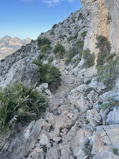 Conexión entre las dos Marinas. Antiguo camino de herradura que comunicaba Callosa con Jalón. Utilizado para pastorear, en el recorrido encontraremos, sesteaderos, corrales y empinados bancales, también se utilizaba para transporte de la uva pasa para la exportación desde el puerto de Javea. La ascensión da comienzo en el camino de los invernaderos, para remontar por un cómodo sendero en Cig- Zas, por la ladera Sur de el Campana. Pasado el Corral de Roig, entramos en una pista forestal, entre pinos, para conectar con una senda ascendente, hasta el Fort, donde conectamos con la ruta turística, PR.CV - 7, que seguimos hasta el Mirador del Coll de l' Orenga, punto de regreso.