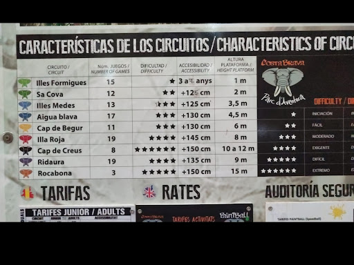 Read moreAttention à tous les français !!! Beaucoup trop cher! Pour une famille à 4 personnes :160 euros et si vos enfants sont comme tous les autres,vous le faites en 2 h!!!! Pas étonnant qu au parking il y a pas plus que 5 voitures -que des touristes étrangers égarés. C'est vrai qu on ne se bouscule pas, mais du tout-quasimemnt vide en plein mois d aout ...deuxième attention- vous ne pouvez faire un circuit qu une seule fois!!! Une seule fois pour ce prix de fou! À un forfait de 5 circuits pour 39 euros- à chaque circuit on vous enlève un bracelet du poignet- vous en avez 5, il existe d autres forfaits plus chers. ((À privilégier à ce prix d autres activités sportives - juste à côté, à 20 m, un petit tennis club (terre batue-4 terrains dont un ombragé !!!! tenu par des français adorables! Elvire et Bruno).Le prof Theirry est exceptionnel, le soir le club vit en atmosphère amicale et joyeuse. Vous avez le rapport qualité/prix dans ce petit club de tennis- à ne pas le confondre avec l énorme club de tennis à 500 m du parc où les profs et les terrrains sont chers et jamais disponibles -pas avant une semaine!!! )). Le parc Pour une famille avec deux enfants, c est horriblement cher ! L accueil du parc est très bien, mettent d efforts, par contre le briefing - très très limité, explications en anglais et qu au premier enfant qui fait et qui essaie et le deuxième ne fait que regarder !!! Avantage du parc-ombragé et calme mais beaucoup...
