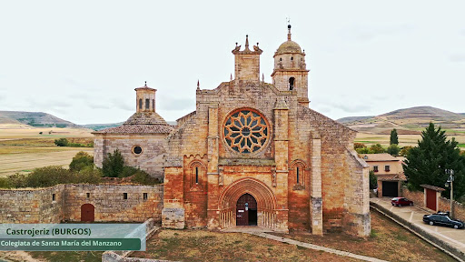 Algo más adelante de las ruinas del convento de San Antón de Castrojeriz, en dirección al centro histórico de la villa, se encuentra la maciza excolegiata de Santa María del Manzano. Mandada construir en 1214 por la madre de Fernando III el Santo y reina de Castilla, Dña. Berenguela la Grande, la portada principal de estilo gótico es realmente atractiva: varias arquivoltas apuntadas, las estatuas de la Virgen y el arcángel San Gabriel, y el imponente rosetón también gótico, componen un dibujo de piedra de buen gusto. La otra portada meridional renacentista no es menor, aunque los sillares y piedras parecen algo más gastados, mientras que algunas hierbas han salido en los peldaños de acceso, acaso porque no se usa. Detrás, se levanta una esbelta torre del siglo XVIII, con un campanario y cúpula de cierre en lo alto de la construcción. Es una Iglesia de tres naves, cuya cabecera tienen un retablo vistoso, y en los pies una sillería coral, ambos del siglo XVIII. Con todo, acaso la parte más emotiva del interior sea la capilla que recoge la talla policromada de piedra de Nuestra Señora del Manzano del siglo XIII, que da nombre a todo el conjunto. Esboza una sonrisa calmada, que la hace más cercana. Parece que esta imagen gustó singularmente a Alfonso X el Sabio, tanto que no dudó en componer algunas cantigas o cantos líricos escritos en gallego medieval en su honor. Una de ellas, la 242, repite el estribillo que dice: "O que no coraçón d´ome è mui cruu de creer /pode-o Santa María mui de ligeiro fazer". (" Lo que en el corazón del hombre es muy difícil de creer /San María lo puede hacer muy fácilmente" ). Arte y literatura se funden una vez más en esta magnífica estampa, a la vera del Camino...