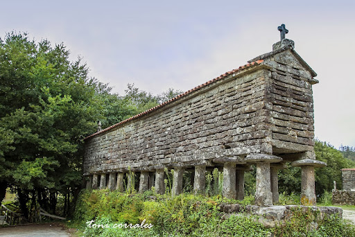 Este estupendo hórreo se localiza al lado de la iglesia parroquial de San Adrián de Toba y es también conocido como Canastro de Caamaño. Su construcción es a base de granito y se engloba en la tipología de los canastros Fisterrás. Tiene 15 m de largo y se sustenta con 13 pares de pies que lo separan del cuerpo con los tornaratos. Tiene dos puertas en un lateral y la cubrición es a dos aguas con teja del país. En el vértice de las sobrepenas tiene un adorno en cada lado, una cruz y un pináculo. Junto a este hermoso hórreo tenemos el conjunto de molinos de Toba, sobre el rego das Laxes, afluente...