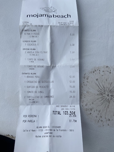 Read moreMojama Beach is the best part of La Barrosa. It was too windy on the beach so we escaped to Mojama Beach Chiringuito for lunch. We didn’t know what to expect, and we were met by a great hostess, we sat right away. Our waiter Izan was so attentive and prompt with our two Cruz Campos ( Spanish beer : ). The food was amazing we had 3 tomato salad and surtido de pescaito. It was perfect, so fresh, plus a bottle of young wine and casera for tinto de veranos. Izan is a great waiter and we will be back with the whole family. We will make reservation next time. A place you don’t...