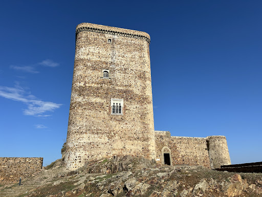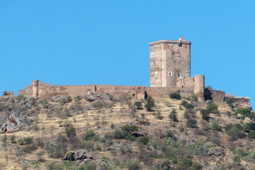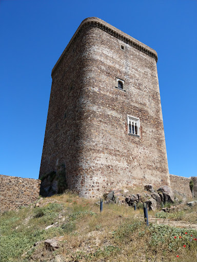 A parte de las buenas vistas quiero compartir para saber algo más.... En la fortaleza de Feria se distinguen dos partes bien distintas, la muralla que delimita el terreno útil del castillo y la gran torre de Homenaje en el interior. El recinto amurallado, con un trazado irregular, está jalonado por torres o cubos redondos y prismáticos. En el interior se levanta otro muro transversal que a modo de muralla diafragma divide el cuerpo principal del castillo en dos partes. En el medio de la muralla diafragma se alza la torre de Homenaje, prismática, de base cuadrada y con chaflán curvo en las esquinas. Con independencia del gran volumen y contundente presencia de la torre, no faltan los detalles constructivos de apreciable elegancia, como los finos enmarques y recercos de algunas de sus ventanas, la puerta de entrada gótica, con arco mixtilíneo cuyos vértices se rematan con rosetas y, sobre todo, la cornisa volada sobre canecillos que sirve de coronamiento y donde se sustentaría el almenaje, así como el matacán redondo sobre cuidadas filas de ménsulas escalonadas de diferente trazado. Como la parte inferior de la torre es maciza se organiza un sistema de acceso de apreciable interés en lo que a seguridad se refiere ya que la entrada se realiza a través del andén de la citada muralla transversal, desembocando en la planta segunda que aquí actúa como principal, desde donde se facilita la bajada al primero y la subida al tercero y desde éste al cuarto piso y luego a la terraza. Creemos que desde el piso inferior debía haber algún acceso a lo que ahora está macizado y que en principio serviría de ubicación a un aljibe o mazmorra como solía ser costumbre y puede verse en otras fortalezas medievales. Dadas las grandes dimensiones de todas estas plantas se hallan debidamente compartimentadas y dotadas con distintos servicios, letrinas, chimeneas y cocina. El Castillo de Feria fue entregado a Lorenzo Súarez de Figueroa de manos de Enrique IV, quien además le otorgó el título de Conde. En época de Felipe II se elevó el rango de la familia y le fue concedido a Don Gómez Suárez de Figueroa el título de Duque. Lo más importante del conjunto fortificado debió ser promovido por Lorenzo Suárez de Figueroa, según puede deducirse por la presencia de las armas de Figueroa y las de los Manuel que se representan en sendos escudos heráldicos que campean en la torre semicilíndrica del recinto, que son asociados con el mencionado Lorenzo Suárez de Figueroa y con su esposa María Manuel. Al menos esta torre y el conjunto del recinto debieron ser construidos algo antes de 1461, fecha en que fallece este personaje, que también fue el constructor del castillo de Zafra y de parte de Nogales. Posiblemente sus descendientes y herederos pudieron terminar la fortaleza construyendo durante el último tercio del mismo siglo XV la gran torre de Homenaje que se eleva...