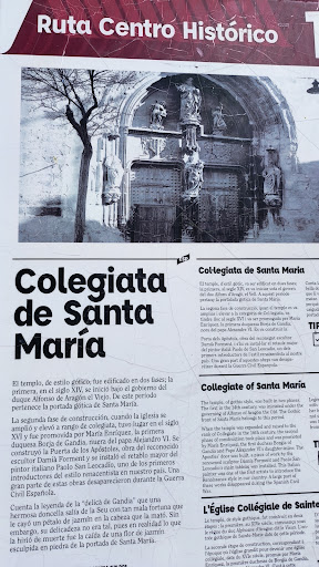 Read moreAhí está ella majestuosa impresionante Santa María de la Asunción , templo de la devoción y amor al culto, en pleno corazón de Gandía. La colegiata de Gandía es una iglesia parroquial de estilo gótico valenciano que a lo largo de su historia fue testigo de grandes acontecimiento.Siempre desde más absoluto silencio, amada y muy querida e incluso por aquellos que la odiaban . Fue agrandada, remodelada varias veces. La iglesia -parroquial-católica tras la caída del Castillo de Bairén a los años 1.245 aproximadamente. Trás ser conquistado el Castillo por el rey Jaime I. Es una obra de las que ya no se hacen ni saben hacerlas. En su forma larga y ancha con habitáculos sostenidos por unas columnas de arcos a todo lo largo de su dos laterales. La Insigne Colegiata de Gandía , es un templo dedicado al culto religioso, muy bonito, con hermosas tallas, con un entramado del techo impresionante y sus numerosos arcos que dan vida . Una joya en pleno Gandía que da vida junto al ayuntamiento hermosa y bonita plaza , pero sin coches al ser posible. Se celebra misas por las mañanas.Es una pena que lugares como estos haya siempre aparcado algún turismo o furgonetas en sus fachadas. No sé entiende que haya lugares a lo largo y ancho de Gandía que no se puede aparcar ni estacionar y precisamente ahí en esta plaza donde nunca se debería permitir lo consientan. Lo hacen sí, pues a mi no me gusta, esta bonita plaza y su joya pierden encanto arquitectónico y artístico..Mata la belleza de esa hermosa plaza y los soportales...