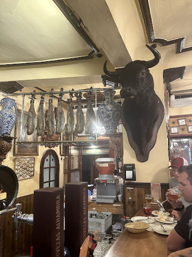 Proper old-world tapas bar, brimming with giddily-eating and drinking local and international punters and lined with cured hams, wine barrels and taxidermy. The tapas were rich and exotic, the gazpacho refreshing, barrel-poured vermut tongue-popping, and there was a great selection of local wines. As per all the best tapas bars, the service was brilliantly terse and unceremonious for such a majestic setting and scumptious provision, with the waiters occasionally yelling monosyllabically for no particular reason and people shouting out their orders from their table with no time for pleasantries. Another world, and a better...
