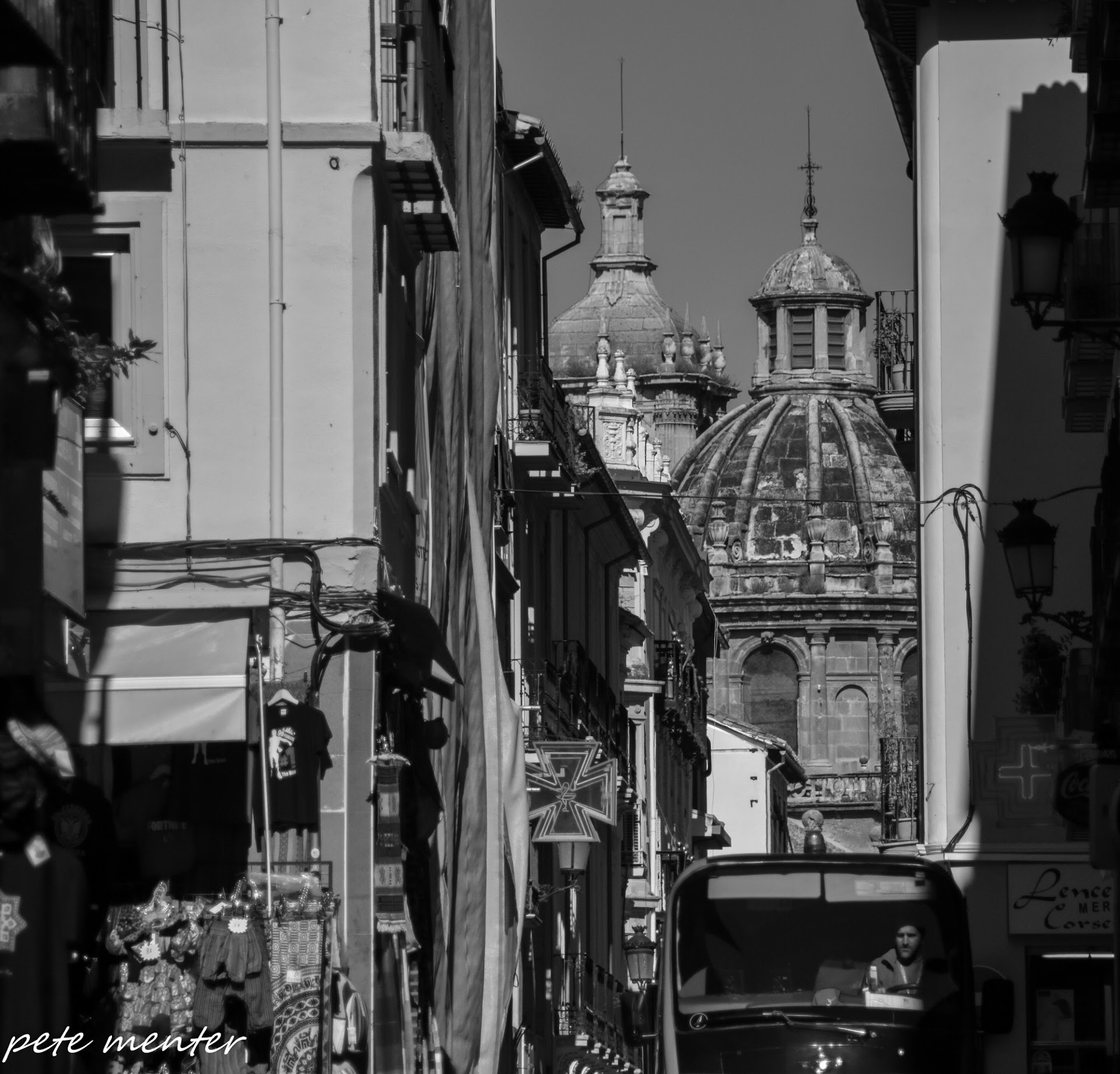 Desde el exterior son dignos de admirar tanto su gran cúpula como la portada principal. Su cúpula hemiesférica, diseñada por el hermano Pedro Sánchez y construida por el hermano Alonso Romero, está rematada por crestería de balaustrada con jarrones y dieciséis costillas que la recorren. La portada principal, que da a la plaza de la Universidad, es obra del arquitecto José de Bada y se realizó en el siglo XVIII. Está formada por dos cuerpos con columnas corintias sobre altos pedestales labrados y con relieves de mármol blanco, representando escenas de la historia de la Compañía de Jesús. Sobre ésta se alza el segundo cuerpo, flanqueado de columnillas con frontón roto por un relieve de la conversión de San Pablo, y encima como remate la estatua de...
