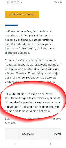 Pues bien, ayer sábado volvimos a repetir y no nos pudimos quedar más defraudados. La misma muestra de lanzamiento, dos proyecciones que si no eran las mismas, serían similares. Muestra de constelaciones sobre la cúpula (muy mal explicadas con el puntero). Y la decepción total fue que ni "simulador 4D" ni "actividad de iniciación al apasionante mundo de la observación del cielo" (cito textualmente lo que hay a fecha de hoy en la página, cuando vas a comprar las entradas, en lo que consisten las actividades. Adjunto foto).