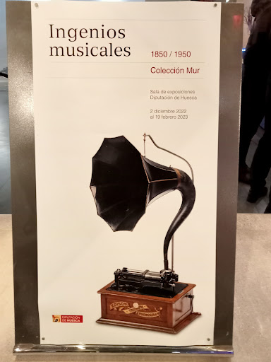 Siempre es que vengo a Huesca encuentro exposiciones interesantes en va esta sala de la Diputación Provincial de Huesca (DPH). En este viaje he encontrado dos eventos expositivos. El primero, en la sala de siempre, se presentaba al público una llamativa muestra de instrumentos para la reproducción musical desde sus inicios históricos. La exposición es muy interesante, máxime por provenir de la colección de un particular, aunque podrían haber trabajado más y mejor su exposición (más vídeos, un sistema de audición de los instrumentos expuestos,...) porque son instrumentos musicales que no se pueden escuchar. Hay además algunas curiosidades estupendas. Estoy pensando en un gramófono "estéreo", un primitivo reproductor Thorens, agujas de gramófono de Pailhard, el primer gramófono de rollos de cera de Edison (en el que el propio Tomás Alba Edison grabó las primeras palabras que el hombre pudo reproducir y que decían " Mary tenía una ovejita de blanco y suave vellón y donde Mary iba andando, la ovejita le iba en pos" traducción libre del inglés),... Es una exposición totalmente recomendable para chicos y chacos. Yo la he disfrutado como un enano. Os dejo adjuntas unas fotografías y sus cartelas para tentaros a acudir a verla.