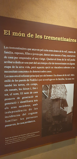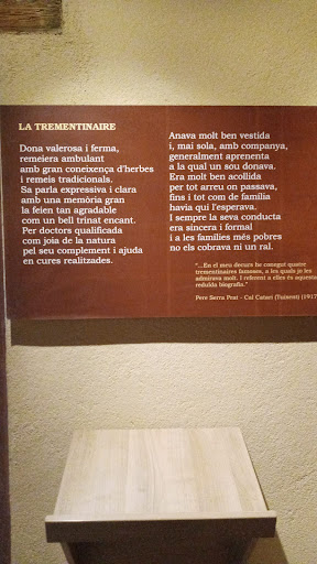 Read moreEspai museistic que recorda com vivien i que feien aquestes persones trementinaires, principalment dones, viatjan sempre a peu, amb un farcell a l'esquena on portaven les plantes remeieres i una gerra-garrafa de metall d'uns cinc litres d'oli al braç, arreu de pobles de gairabé tot Catalunya, arriban inclús a les capitals de provincia, com s'ha dit, sempre, sempre, sempre a peu, i així ho fan constar en l'audiovisual que projecten durant la visita al museu, on també hi ha una reproducció d'una cuina moblada i de com era la distribució. També una serie de plafons explicatius de com vivien i que feien per sobreviure i altres...