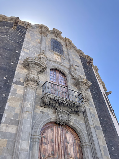The façade is one of the most interesting baroque portals of the Canary Islands. Let's pause for a moment to admire the church's exterior. Note the curved façade that divides the temple's naves and the elegant stone portal. The clock and bell towers arise in the background. Together, the façade and the towers accentuate the church's verticality, projecting a sense of roundness and elevation. A sensation of movement is added with the serpentine cornice and the curve that forms the three naves. The impressive gargoyles influenced by medieval bestiaries and Native American sculptures also accentuate the sensation of movement,...