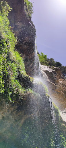Resulta imprescindible detenernos un buen rato y contemplar la cascada, desde su base, a la que accedemos por un tramo de escalones. La perspectiva que obtenemos del salto de agua, desde abajo, es un espectáculo, ya que la lámina de agua, al chocar contra las rocas, se divide en infinidad de gotas que destacan con el contraste de la...