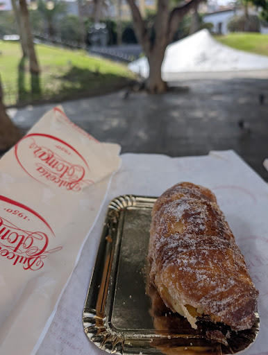 Fabulous! Stopped in to find the most delicious pastries. I selected one (2.2Euro) for takeaway and the friendly worker nicely packaged it up securely like it was a delicate piece of glass. I wandered down the street and opened it on a park bench to find it weighed probably 0.5 kg as it was filled completely with delicious cold custard that complemented the crispy, buttery exterior (that was all covered in cinnamon and sugar). Delicious and everyone should grab a treat for your wander through Vegueta. Don't forget to grab napkins (not included in...