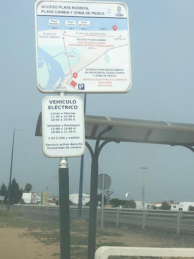 Carretera de acceso cortada a vehículos particulares. Acceso con vehículo eléctrico del ayuntamiento. Horario en la foto. Salida a lado de la carretera cortada. Sino, con bici o andando 1.7 km con el agua, comida, sombrilla, etc. que necesites... . Una faena si llegas tarde por la mañana ya que hasta las 18.00 nada y para volver a las 20.00 pues no merece la pena. Nefasta idea y gestión (sin ningún tipo de información) del ayuntamiento de Lepe. Han conseguido dificultar el acceso antes libre a una buena y bonita playa nudista Mi cero más grande para tan brillante idea.. Añado lo dicho por el conductor de semejante trenecito: caben 13 por viaje; a las 20.00 último viaje de regreso. Los que no caben, a andar los dos km con las sombrillas. Son las 16.30 y en la playa estamos unos 35.... Cabemos justo, eso sí, habrá que esperar al sol con 32° por orden de llegada. Si eres el número 14, a esperar 40 min al sol a que vuelva.... Tras 15 años viniendo a esta Playa, y pagando alquiler vacacional, comidas, etc. Yo no vuelvo. Bravo por el...