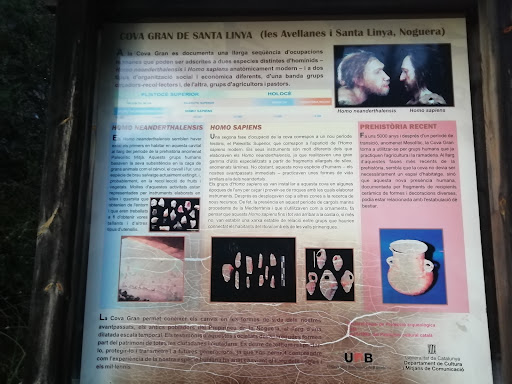 La Cueva Grande de Santa Linya Se trata de una inmensa cueva de una gran belleza cromática, que cobija 2800 m2 que se disputan escaladores y arqueólogos, como ya hicieron, hace unos milenios atrás, los últimos Neandertales y los primeros Sapiens. Según los escaladores, es el mejor lugar del mundo para realizar escalda deportiva.El hecho de que salga a menudo en revistas especializadas y la presencia constante de gente mediática en la zona hace que venga gente de todo el mundo a hacer escalada. Para llegar a la cueva se puede llegar desde distintos puntos dependiendo de lo que uno quiera caminar. La verdad que es un lugar que sorprende muchísimo. En la cueva también podemos encontrar grabados rupestres y atraves de los diferentes estudios realizados se han llegado a la conclusión por los materiales encontrados que vivieron el hombre de Neandertal i el Sapiens. Vale mucho la pena dedicarle un tiempo a este...