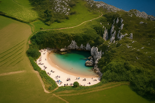 Lo más increíble es que esta playa no tiene salida directa al mar. El agua llega a través de una cueva subterránea y cristalina que se llena con la marea alta. Si vas en el momento justo, es un auténtico espectáculo. El entorno es absolutamente mágico: acantilados, cuevas, un enorme bufón, y unas vistas increíbles al Cantábrico. Recomiendo muchísimo llevar linterna y explorar la cueva cercana a la entrada, ya que al final te espera una apertura con vistas al mar que te dejará sin palabras.