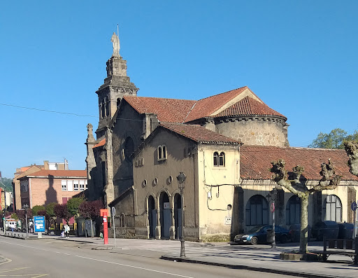 Iglesia de San Esteban (Ciaño) La Iglesia de San Esteban es un templo de origen románico ubicado en la parroquia de Ciaño, en el municipio asturiano de Langreo. Conserva de su primitiva fábrica dos portadas: la de los pies o de acceso principal, situada al oeste, y la Sur, posiblemente de finales del siglo XII o principios del siglo XIII. A principios del siglo XX el templo sufrió una restauración historicista, neorrománica, tendiendo a concordar con lo que fue el anterior edificio. Se estructura en planta de cruz latina con capillas panteón adosadas a los muros de la nave y "deambulatorio". Tiene un pórtico delantero cerrado con una torre campanario rematada con una escultura del Sagrado Corazón, que sustituyó a un tejadillo a cuatro aguas anterior. La portada principal, la del oeste, es la de mayor valor artístico. Está formada por un arco de medio punto con tres arquivoltas decoradas con motivos en zig-zag, picos de aves mordiendo un baquetón y boceles con bolas; apoyan en seis columnas, tres por flanco, las dos interiores más gruesas, rematadas por capiteles con variada decoración escultórica, fundamentalmente de temas vegetales estilizados y escenas humanas: en una de ellas está representado el martirio de San Esteban. En el tejaroz la decoración es a base de motivos zoomórficos y antropomórficos. La portada sur, en la fachada del lado de la espístola, tiene un arco ligeramente apuntado de dos vueltas, una de ellas polilobulada, que apoyan en dos machones y un par de columnillas con capiteles decorados con pájaros afrontados y sirenas; el guardapolvos y la imposta son ajedrezados. Estas dos portadas románicas, por su decoración tan elaborada, parecen relacionarse con el taller románico de Villaviciosa. En el interior destaca un sencillo pero elaborado retablo de madera. La bóveda de horno está ricamente decorada. Cuenta con un órgano en el coro. Cuenta con otro retablo dedicado a Santa Bárbara y otro con Cristo...