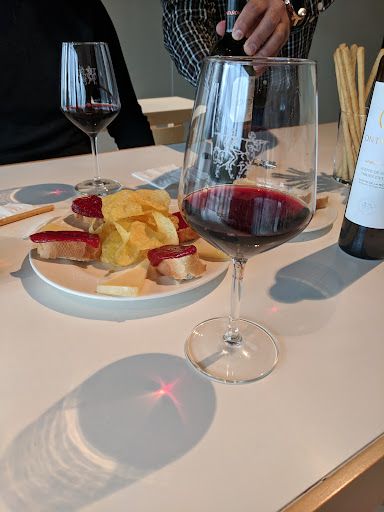Read moreBuscábamos una bodega donde realizar una cata y en el hotel nos aconsejaron esta. Cuesta igual que la mayoría, 14€, y nos ofrecían la visita guiada y 3 (no 2 como otras) catas de sus vinos con un aperitivo (no te dan en todas y son de salchichón o chorizo). Bueno, la bodega, en el mismo Logroño a las afueras, preciosa con vidrieras, esculturas, fotografías artísticas y cuadros muy interesantes. La guía, muy simpática, nos hizo una visita a través de la historia del vino y acerca de las barricas, pero lo mejor llegó cuando nos ofrecieron la cata y el soumelier (muy "enrollado" y simpatiquísimo) nos enseñó cómo tomar y diferenciar los diferentes caldos. Interactuamos todos y aquello se nos fue de las manos: aquellos vinos estaban deliciosos, uno blanco de barrica, un tinto reserva del 2010 y, el que más me sorprendió gratamente, uno blanco dulce fresquito y buenísimo. Todo ello acompañado de grisines, pan con aceite arbequina de la casa, platos con queso y montaditos con pimientos de piquillo. Nos sirvieron cuanto vino quisimos y se abrió alguna botella más. Todo acompañado de buen ambiente y risas que nos llevaron a todos a comprar aquellos vinos sorprendentes. Gracias a todos que lo hicieron posible. Volveremos, sin duda,...