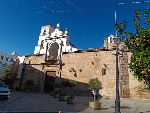 La puerta de Santa María o de la Guía: da a la Plaza de España. Sobre la puesra hay una capilla de la virgen de Guía que contrata por ser de paredes encaladas blancas en lugar de piedra como es la fachada. Esto se debe a una ampliación del templo La puerta del Perdón: da la plaza de Santa María, donde está el monumento a los cofrades. Sobre la puerta principal existe una primera planta con un pequeño balcón. A los lados de la puerta del balcón se encuentran los escudos de Mérida y de la orden de Santiago entre dos relieves de columnas corintias Más arriba destaca la torre campanario La puerta de San Juan Macías. en el lateral opuesto a la plaza de España. De estilo renacentista y sobre la cual nuevamente se encuentran el escudo de Mérida y de la...