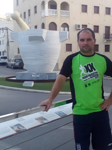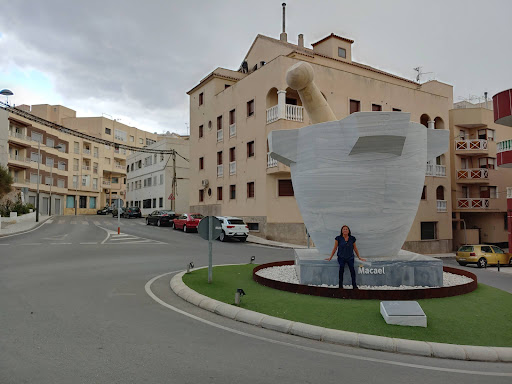 Read moreMACAEL. (ALMERIA). MORTERO MÁS GRANDE DEL MUNDO. Figura en el libro Guinness de los Records según la placa conmemorativa que consta y otorgado el 28 de Marzo de 2015. Como dice la misma placa es un monumento tanto a las canteras me mármol de Macael como a sus artesanos. Su base está elaborada en mármol blanco con unas dimensiones 3,29 metros de alto 3,07 metros de diámetro interno de la boca con un peso de 30,95 toneladas. La mano (el palo) está hecho de mármol amarilla con una altura de 4,73 metros de altura 0,85 metros de diámetro y un peso de 5,82 toneladas. Situado en una plaza en las confluencias de la carretera AL8411. Avenida de Paco Consentino. El día que fuimos a verlo nos sorprendió una “gota fría” con una granizada impresionante que en pocos minutos inundó la parte baja del pueblo y la rambla. Tuvimos que refugiarnos como pudimos y “esperar a que pase el chaparrón”....