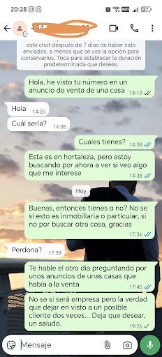 Read moreHace varios años intenté comprar a través de esta inmobiliaria, pidiendo información y lo típico, en ese momento nefasta la profesionalidad de la persona que me atendió (en resumen fui la primera persona en interesarme por una casa, me dijeron que me avisarian y me la enseñarian a mi primero y a los días de no saber nada les llamo y resulta que la han vendido...) , pasado un tiempo he intentado volver a dar una oportunidad a esta inmobiliaria, y parece que sigue igual o peor, a ver si responden antes aquí que al WhatsApp donde te dejan en visto si no especificas por qué casa estas interesado, parece que algo turbio hay detrás o pocas ganas de trabajar. Añado captura de la conversación al móvil que publican en...