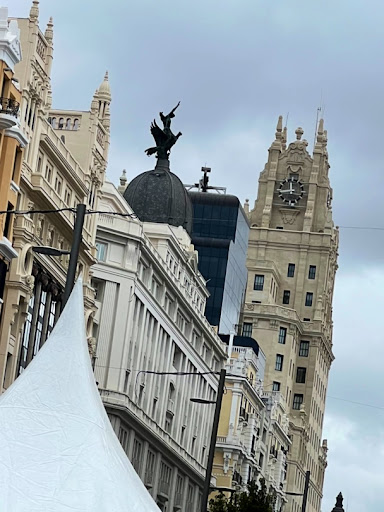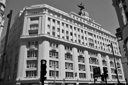 Portentoso porte de uno de las edificaciones que surgieron en la construcción de la Gran Vía madrileña. Edificio construido entre los años 1920 y 1924 por el arquitecto vasco Teodoro de Anasagasti y Algán (Bermeo, 1880-Madrid, 21 de agosto de 1938), siguiendo el proyecto del arquitecto francés Gaston Braive. Diseñado para ser sede de los primeros grandes almacenes en Madrid distribuidos por departamentos. Promovidos por la Sociedad Madrid-París, que dieron nombre al edificio. Inaugurados en 1924 por los reyes Alfonso XIII y Victoria Eugenia. Los almacenes cerraron en 1933, siendo ocupado el edificio por un cine, locales comerciales a pie de calle y SEPU (acrónimo de «Sociedad Española de Precios Únicos») que fue la primera cadena de grandes almacenes de España y permaneció abierta hasta 2002. En el año 1956 siendo ya propiedad de la empresa de seguros La Unión y el Fénix, se acometió la reforma más profunda por el arquitecto Fernando Cánovas del Castillo coronando el edificio con la escultura del ave fénix de Mariano Benlliure. En la década de los 80 fue adquirido por el grupo PRISA. En 2011 recupera su función original excepto en las plantas ocupadas por la cadena SER. El 15 de octubre de 2015 se inauguró la tienda de Primark más grande de España, que ocupa las cuatro primeras plantas...